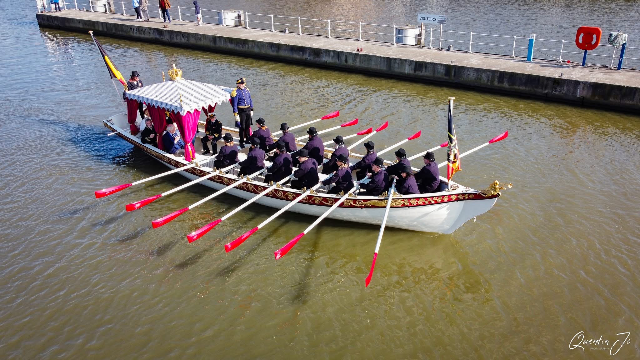 Un fringeant équipage de 14 rameurs issus du SNUB Aviron et de Zinneke.Brussels en tenues qui évoquaient les uniformes de 1835, ainsi que des acteurs représentant SM.Leopold Ier, la Reine Louise, le Prince Léopold, un Ministre, flanqués de l'Amiral Botman et le Baron de Gerlache, ont ainsi fait le premier voyage sur l'eau sous le commandemant de Nicolas Joschko et d'Olivier Deswaene.